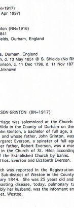 Child 5. John Grinton- V born 10th Jan 1816 in Auchtertool and baptised on 12th Feb that year. He married Margaret Everson [1821-1844] at St Hild'as Church South Shields Durham on 16th April 1841, They did not have children. On 7th Nov 1850 he married Isabella Wright at St Stephens Church South Shields and they had 2 children: John VIII [1854-1899] and Jane Isabella known as Isabella who married Kenneth Adamson and appeared to stay in South Shields. They had a daughter Margaret.
